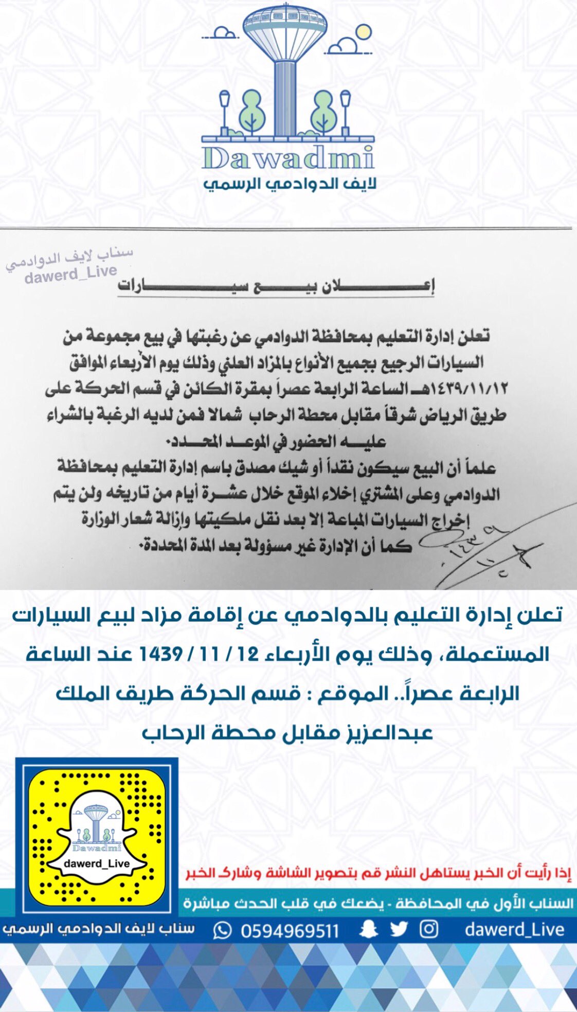 سناب لايف الدوادمي الرسمي Pa Twitter تعلن إدارة التعليم بالدوادمي عن إقامة مزاد لبيع السيارات المستعملة وذلك يوم الأربعاء 12 11 1439 عند الساعة الرابعة عصرا الموقع قسم الحركة