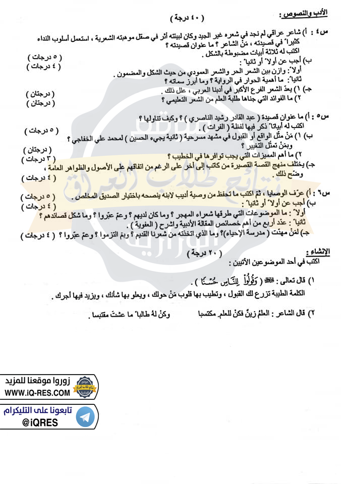 اسئلة اللغة العربية للصف السادس ادبي الدور الثاني 2018