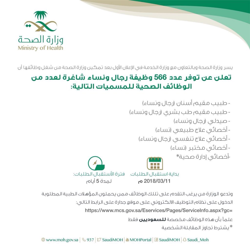 المساعد En Twitter وزارة الصحة بالتعاون مع وزارة الخدمة المدنية تعلن عدد 566 وظيفة صحية للرجال والنساء التقديم عن طريق نظام جدارة بموقع وزارة الخدمة المدنية Https T Co Iad2srco3m من غدا الأحد 1439 6 23 ولمدة